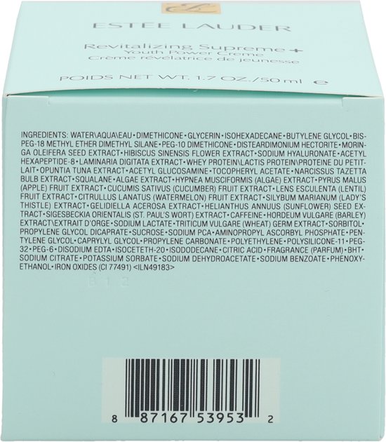 Exclusief Hibiscus Ochtendbloei-extract. De natuur op haar krachtigst. Estée Lauder wetenschappers ontdekten dat Hibiscus sinensis bloemen die vroeg op de dag geoogst worden de hoogste collageen stimulerende activiteit bezitten. Daarom verzamelen we ’s ochtends met de hand geselecteerde bloemen voor een optimale werking, waarna we in een proces dat 83 dagen duurt van oogst tot productie, ons extract creëren dat het natuurlijke collageen van de huid krachtig helpt te stimuleren.Exclusief Moringa-extractAl duizenden jaren staat de Moringa-plant (vaak de “wonderboom” of “levensboom” genoemd) bekend om zijn uitzonderlijk voedende kwaliteiten. Het bevat de belangrijkste bouwstenen van het leven – calcium, kalium, vitamine C, aminozuren en omega 3. Het is een van de krachtigste antiverouderingsingrediënten die we ooit hebben ontdekt. Extracten van cactusstamcellen en hyaluronzuurAanvullende hoogwaardige ingrediënten dragen bij aan de kracht van Revitalizing Supreme+. Een infusie van Cactusstamcelextract en hyaluronzuur helpt een sterkere, gevoede huid te onthullen, verzadigd met 72-uur hydratatie. De vitale vochtbarrière van de huid wordt versterkt.Collageenversterkende technologieOnze formule combineert onze natuurlijke ingrediënten met onze Collageen Boosting Technology, om de kracht van de huid weer op gang te brengen, zodat de huid steviger aanvoelt en er meer gelift uitziet.