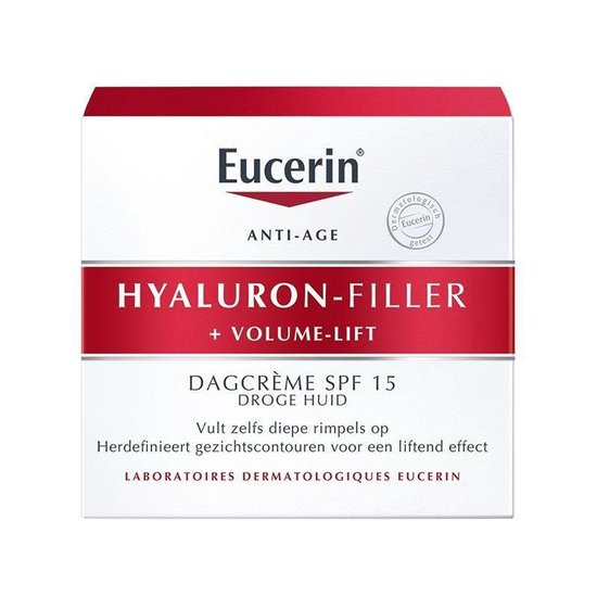 Eucerin Hyaluron-Filler + Volume-Lift dagcrème met 3 specifieke ingrediënten, voor vermindering van volumeverlies, duidelijk gedefinieerde gezichtscontouren en meer versteviging. Het hoogst effectieve ingredient Magnolol, verbetert de celregeneratie en verhoogt het aantal volumegevende cellen. Oligopeptides versterken de verbinding tussen opperhuid en lederhuid en verbetert hiermee tevens de aanmaak van collageen zodat de huidstructuur sterker wordt. Hyaluronzuur verbetert de vochthuishouding en pakt rimpels aan. Bevat SPF 15 met UVA bescherming.