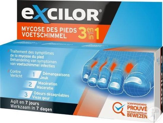 <p>Excilor Voetschimmel 3 in 1 is een effectieve behandeling tegen de symptomen van voetschimmel die jeuk, maceratie en vieze geurtjes tegengaat.</p>