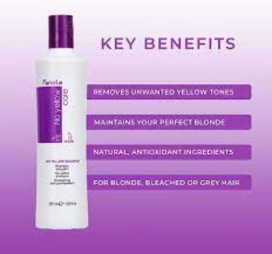 Fanola No Yellow Shampoo bevat paarse pigmenten, waardoor de gele tint uit het haar verdwijnt. Fanola is de meest populaire shampoo die gebruikt wordt in blond(geblondeerd), Highlights, Coupe soleil, Balayage of grijs haar en is bedoeld om die mooie koele kleuren (ijs, as en grijs tonen) langer te behouden. Door verschillende oorzaken, kan er soms een gele gloed in je gekleurde haar komen. Verkleuring kan ontstaan door de omgeving of doordat je het hebt geblondeerd. Als jouw haar rood pigment bevat (door het verven of van jezelf) en je wilt je haar blond verven, kan het voorkomen dat je oranje, geel of blond haar krijg met een te warme gele gloed. Het is een veel voorkomend probleem. Je wilt een mooie koele blonde tint maar het wordt warmer of geler dan je zelf wilt.