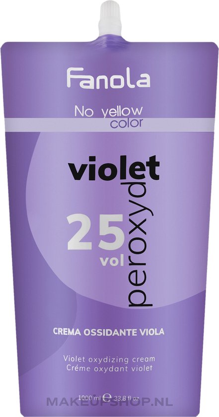 Fanola Violet Peroxide 25 Vol 1000 ml is een waterstof van Fanola. Deze waterstof met paars pigment neutraliseert de gele tinten vanaf het begin van de kleurbehandeling. De waterstof kan gebruikt worden bij de No Yellow en Fanola Cream Color verflijn. De peroxide zorgt ervoor dat deze kleuren en producten goed door het haar worden opgenomen. Belangrijkste eigenschappen * Waterstof Peroxide. * Geschikt voor Fanola No Yellow Color en de Fanola Cream Color haarverf. * Neutraliseert een gele gloed. * Cremige oxidant. * 25 volume, 7,5%. * Inhoud: 1000 ml. Gebruiksaanwijzing * meng de No Yellow Color Violet Oxydatie 7,5% volgens de juiste mengverhouding van het gemixte product. (bijv. voor Fanola Color en No Yellow Color 1:1,5). * Meng tot een homogene massa en breng aan op het haar. * Gebruik altijd geschikte handschoenen. Fanola Violet Peroxide 25 Vol 1000 ml kopen bij Shop de Fanola Violet Peroxide 25 Vol 1000 ml direct online en wij zorgen dat deze zo snel mogelijk bij je wordt bezorgd!