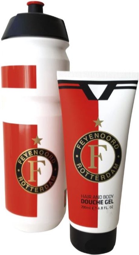 De set bestaat uit een Feyenoord bidon van 750ml en een Feyenoord douchegel van 200ml.