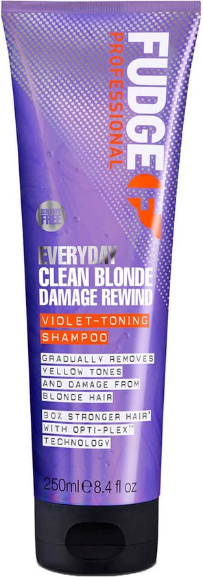 Fudge Everyday Clean Blonde Damage Rewind Violet Shampoo houdt blonde haren helder en gezond! De Fudge Everyday zilvershampoo neutraliseert gele tinten geleidelijk uit het haar. Daarnaast blijft de Damage Rewind met de OPTI-PLEX technologie het haar herstellen, versterken en hydrateren. Hierdoor wordt beschadigd haar door chemische behandelingen als blondering weer hersteld. De zilvershampoo is speciaal gemaakt om dagelijks te gebruiken en om de mooie kleur te behouden.