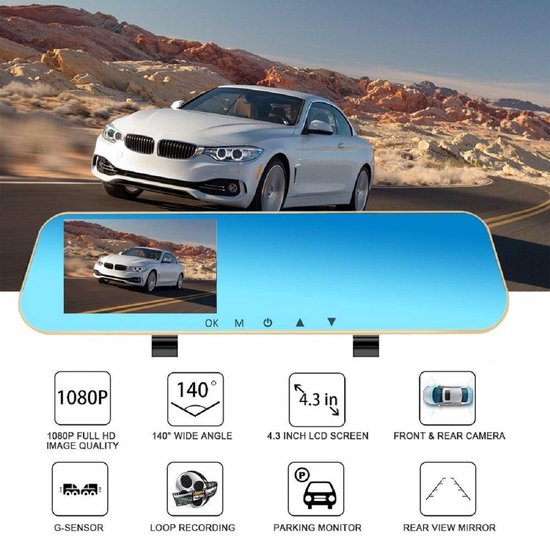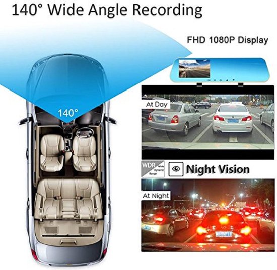 Full HD auto dashcam spiegel, autoblackbox DVR, voor en achter camera.