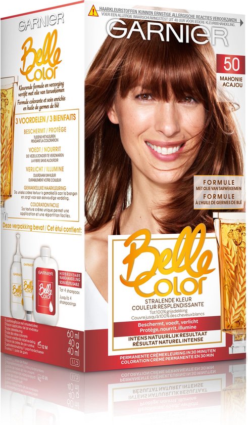 Met haar genuanceerde haarkleuringen biedt Garnier Belle Color een harmonieus en stralend resultaat met 100% grijsdekking. De kleur is zo natuurlijk, subtiel en met natuurlijke schakeringen, zonder helmeffect, dat men zou denken dat het uw eigen haarkleur is. De verzorging verrijkt met argan olie is het geheim van een uniek zijdezacht en natuurlijk gevoel. Na de haarkleuring is het haar intens gevoeld, ultrazacht en glanzend. De unieke crème wordt als een shampoo aangebracht, voor een gemakkelijke en uniforme toepassing.Natuurlijk resultaat gegarandeerd.