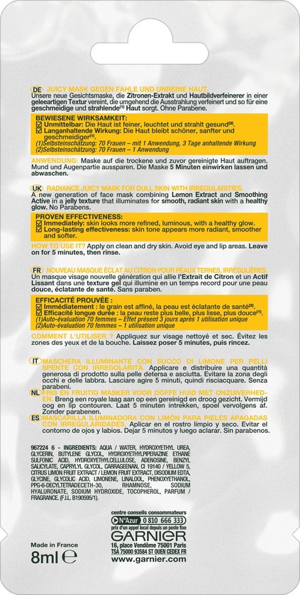 GARNIER – Moisturizing Mask with Lemon Extract for Shiny and Tired Skin Active (Juicy Mask) 8 ml – 8ml