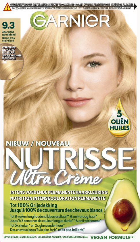 Nutrisse Ultra Crème 9.3 Zeer Licht Goudblond – Voedende HaarverfIntens voedende permanente haarkleuring die tot 100% grijsdekking biedt Langhoudend kleurresultaat en anti-droog haar Tot 5x sterker* en 2x glanzender* haar *Instrumentele test