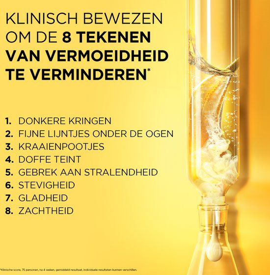 - Klinisch bewezen om de 8 tekenen van vermoeidheid te verminderen****: Donkere kringen, fijne lijntjes onder de ogen, kraaienpootjes, doffe teint, gebrek aan stralendheid, gladheid en zachtheid. ****klinische score, 75 personen na 4 weken, gemiddeld resultaat, individuele resultaten kunnen verschillen.