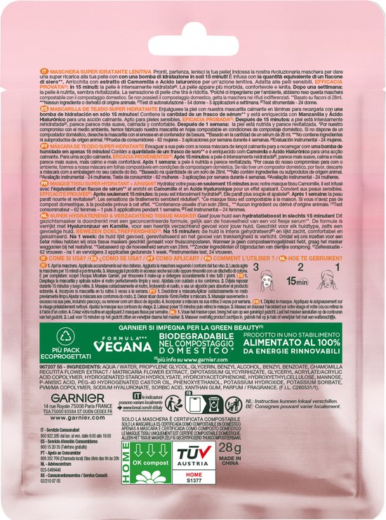 Garnier Hydra Bomb Tissuemasker met Kamille en Hyaluronzuur. Voor intense hydratatie: – Verzacht de droge en gevoelige huid – Verrijkt met een kalmerend kamille-extract – Geeft de huid een boost in 15 minuten* Bevat kamille-extract, bekend om zijn kalmerend effect op de huid. Het hydrateert, voedt de huid onmiddellijk en laat een comfortabel gevoel achter die het trekkerig gevoel vermindert. *Zelfevaluatie – 54 vrouwen – 3 applicaties in 1 week.