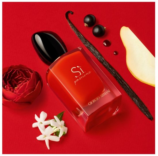 Giorgio Armani Sí Passione EDP is een gepassioneerde, onweerstaanbare en verleidelijke Eau de Parfum die sensualiteit, zelfvertrouwen en passie uitstraalt. Deze geur wordt geleverd in een prachtige rode flacon die de vrouwelijke vrouw vertegenwoordigt, met de prachtige, dieprode lippenstift die uitstraalt elke keer dat ze de deur binnenstapt. Giorgio Armani Sí Passione EDP opent aan de bovenkant met pittige en sappige tonen van onder andere roze peper, peer en prachtige bosbessen die in het oog springen en je meteen doen verlangen naar meer. Het hart is verrijkt met rode roos, bloeiende jasmijn, evenals geurige heliotroop, die met zijn krachtige tonen zacht eindigt aan de onderkant, met onder andere zoete vanille en warm hout dat het hele lichaam omarmt. Verwen jezelf en je vriendenkring met deze verslavende en intense EDP die zelfs door de meest kwetsbare vrouw kan worden gebruikt die een beetje van haar kracht wil tonen in de vorm van een geur.