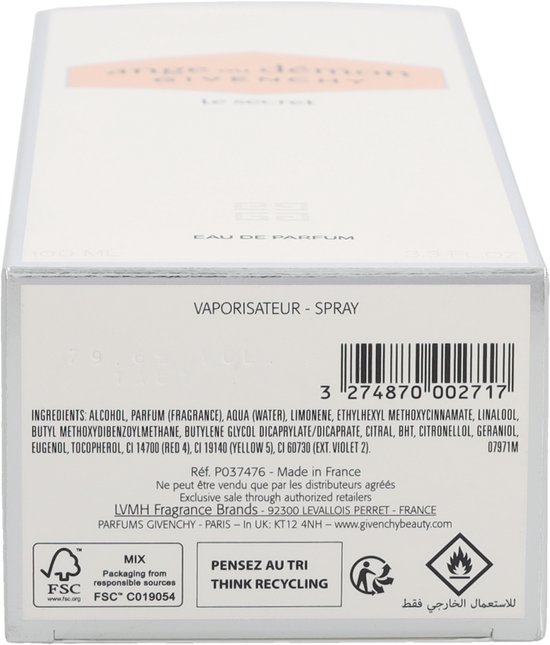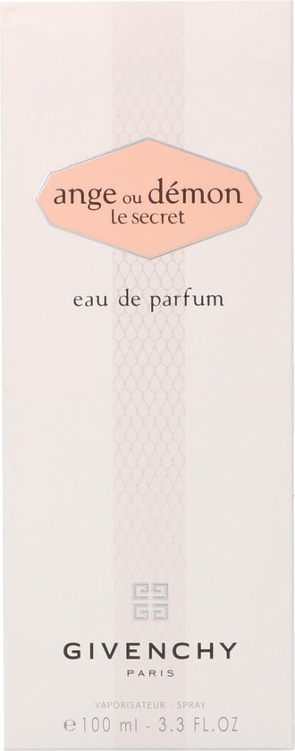 Ange ou Demon Le Secret Eau de Parfum is een bloemige geur voor dames De topnoten van deze geur zijn Thee Cranberry en Amalfi Citroen De hartnoten zijn Pioenroos Jasmijn en Waterlelie De basisnoten zijn houtachtige Noten en Patchouli Deze geur werd uitgebracht in 2009