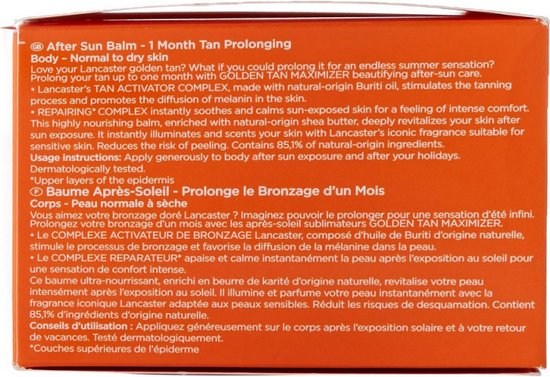 Ben jij ook zo dol op je gouden teint Golden Tan Maximizer After Sun Balm van Lancaster verlengt je bruine teint tot A c A c n maand en houdt je huid stralend en egaal Het hydrateert kalmeert en helpt de huid herstellen na blootstelling aan de zon Deze Sun Balsem is de redder in nood voor de droge vochtarme huid na een lange zomerdag Het is rijk aan sheaboter en ideaal voor de gevoelige droge en vochtarme huid die comfort voeding en hydratatie nodigt heeft