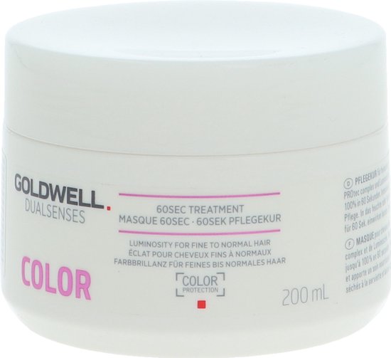 Goldwell New Dualsenses Color 60sec Treatment masker voor fijn tot normaal haar verrijkt met microPROtec complex en Luminescine Regenereert het haar direct tot 100 in 60 seconden Intensiveert de kleurbriljantie en biedt voedende verzorging Gebruik Aanbrengen in vochtig haar Laat 60 seconden inwerken en spoel zorgvuldig uit