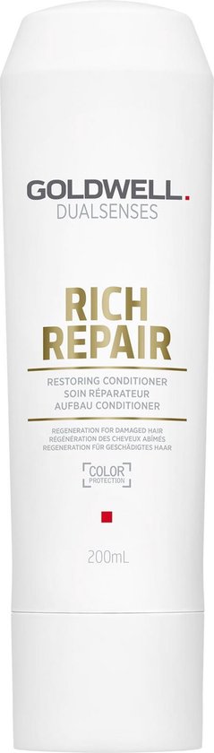 Goldwell Dualsenses Rich Repair Restoring Conditioner Deze conditioner is geschikt voor droog en gestrest haar en gevuld met Pashima zijdeproteA nen Het haar krijgt zichtbaar een gezondere glans en het haar voelt zijdezacht en soepel aan De conditioner bezorgt het haar een dagelijkse reiniging met repair effect voor een verbeterde doorkambaarheid Gebruik Breng de conditioner aan op haar dat gewassen is met Goldwell Dualsenses Rich Repair Shampoo Laat de conditioner een minuut inwerken en spoel deze zorgvuldig uit het haar