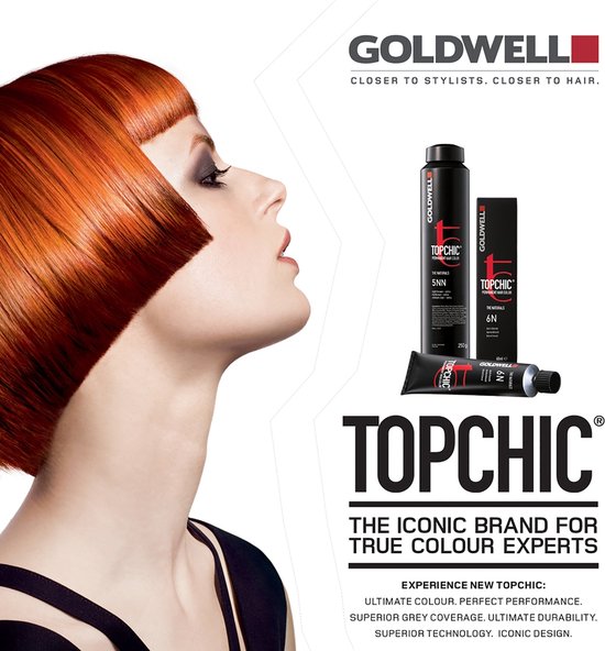 De nieuwe Topchic Haircolor heeft een verbeterde formule voor maximaal resultaat. De actieve combinatie van de gepatenteerde Co-enzym Technologie en het innovatieve Color Equalizer Systeem biedt extra voordelen:ongekende briljantie en intensiteit, nog gelijkmatigere kleurresultaten en verhoogde dekking, stralende glans, merkbare souplesse en een nog aangenamere geur. Kenmerkende eigenschappen: Mild-alkalische haarverf (creme-gel) voor maximale dekking. Een verzorgingscomplex uit vitaminen (B, C) en plantenextracten beschermen het haar al tijdens het kleuren. Bij normale kleuringen wordt 6% peroxide gebruikt, waardoor het haar zoveel mogelijk wordt ontzien. Uitgekiend penetratiesysteem waarborgt een gelijkmatig kleurresultaat. Gepatenteerd kleurmolecuul TRAP zorgt voor extra lange houdbaarheid: na meerdere keren wassen, maar ook na intensieve UV-straling en na permanentbehandeling. Zelfs modetinten blijven langer mooi.