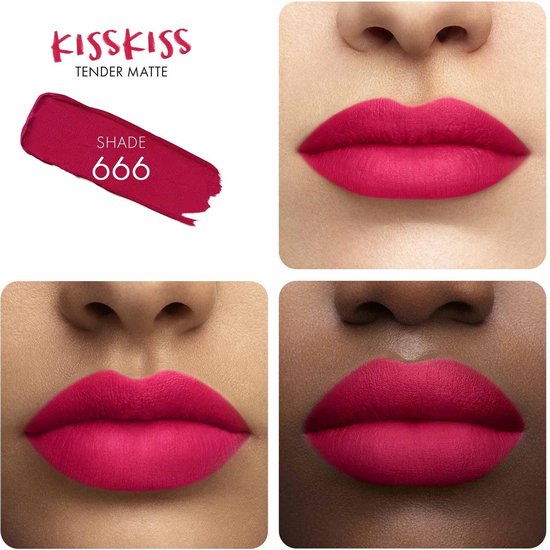 De lipsticks uit de KissKiss Tender Matte van Guerlain zijn dankzij de formule zijde zacht De ingredienten zoals Sheaboter en rozenblaadjes zorgen ervoor dat de lippen gevoed en verzorgd worden met een matte finish Een lipstick die tot wel 12 uur blijft zitten met de perfecte kleur Dankzij de lichtgewichte formule voelt de lipstick heerlijk aan op de huid Geschikt voor alle huidtypen