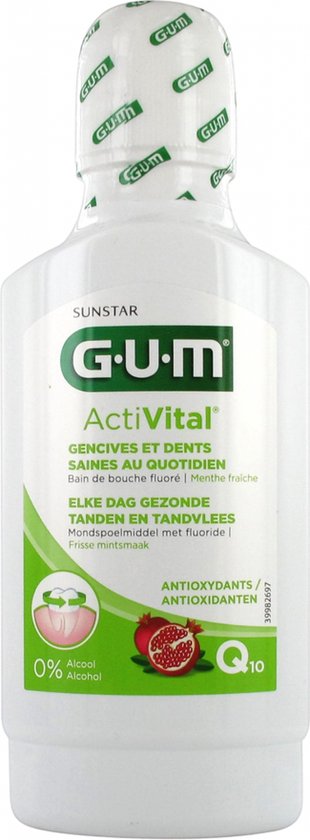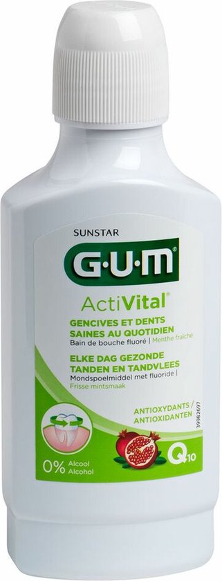 GUM ActiVital Mondspoelmiddel 300 mlHet ActiVital mondspoelmiddel is op basis van natuurlijke ingredinten en geschikt voor dagelijkse mondverzorging. Het mondspoelmiddel zorgt ervoor dat plaque zich minder snel kan vormen en bevordert de gezondheid van het tandvlees.