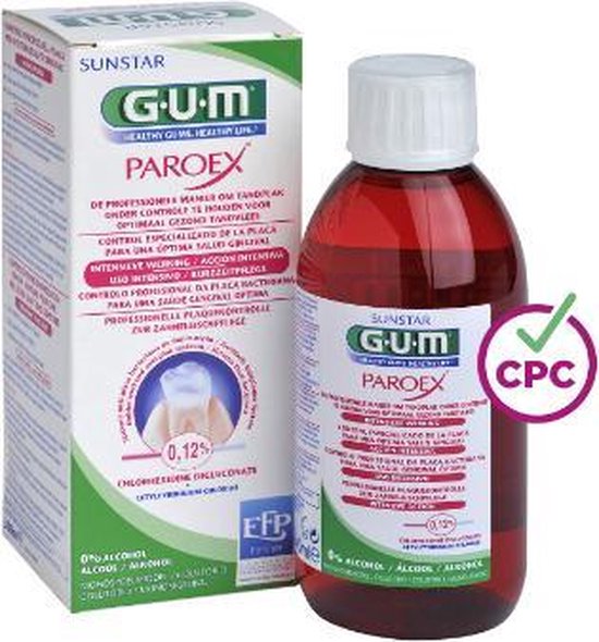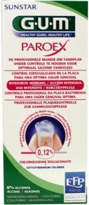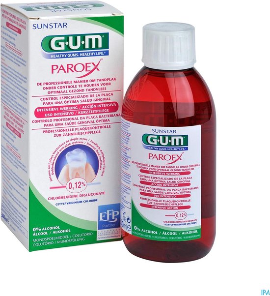Gum Paroex Mondspoelmiddel is speciaal geschikt voor professionele plakbeheersing bij parodontale problemen (gingivitis, parodontitis). Het resultaat van de behandeling zal langer merkbaar zijn en nieuwe plakvorming wordt tegegegaan.
