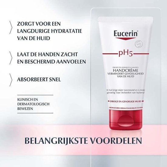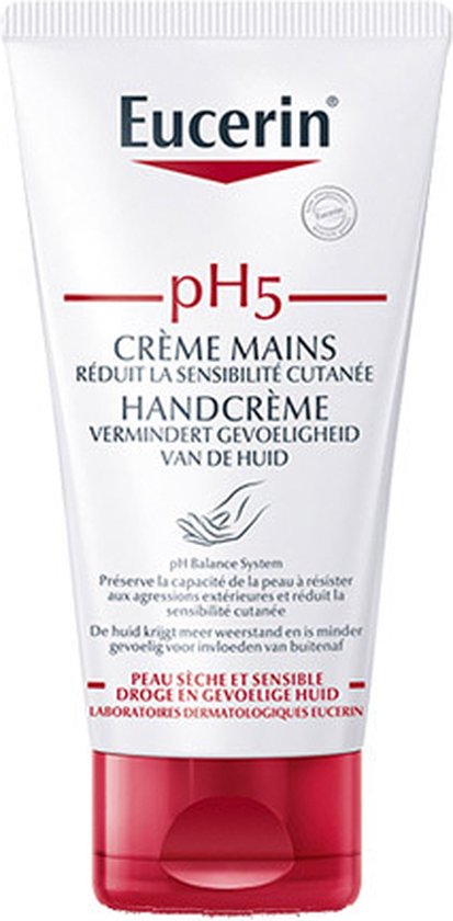 Eucerin PH5 Handcreme 75ml Deze handcreme is speciaal ontwikkeld door Eucerin voor de specifieke behoeften van de gevoelige huid Verzorgt en beschermt langdurig en herstelt efficient Uw handen zijn langdurig beschermd tegen uitdroging Ze voelen zacht en soepel aan Gebruik Aanbrengen op de schone huid van de handen zo vaak als gewenst Niet afspoelen De PH5 EnzymeProtection van Eucerin heeft bewezen het natuurlijke afweersysteem van de huid te behouden De speciale combinatie met de PH5 citraatbuffer en uiterst milde bestanddelen beschermt de huideigen enzymen en versterkt de beschermende zuurmantel