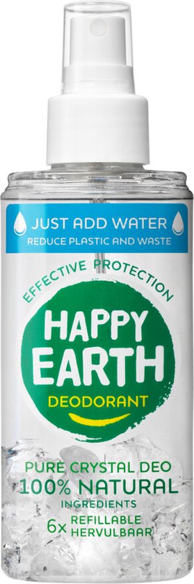 Happy Earth 100% Natuurlijke Deodorant Just-add-Water Unscented Spray <p>HAPPY EARTH 100% NATUURLIJKE JUST ADD WATER DEO SPRAY Unscented Happy Earth “Just add water” deodorant is een pure duurzame deodorant en de goedkoopste deo in gebruik. De deodorant bevat maar één ingrediënt: stukjes pure aluinsteen. Je kan de fles zelf vullen met water waardoor de werking van de aluinsteen geactiveerd wordt en je op natuurlijke wijze langdurig beschermd bent tegen lichaamsgeur. Daarnaast is de fles tot 6x hervulbaar! Hierdoor verminder je het gebruik van plastic én bespaar je afval. Ook voorkom je ook het onnodig vervoeren van water en de daaruit volgende CO2 uitstoot! Deze deodorant is geurloos en hypoallergeen. Met trots dragen wij ook de keurmerken van NATRUE, Vegan Society en Zero Plastic Inside. Met deze deodorant zorg je goed voor jezelf en voor onze aarde! Een deo spray om happy van te worden:</p> <ul> <li>100% natuurlijk, 100% effectief en bevat 0% chemicaliën</li> <li>Vegan en niet op dieren getest</li> <li>Biedt 24 uur lang bescherming</li> <li>Bevat maar 1 ingrediënt: natuurlijk aluinsteen</li> <li>Geurloos en hypoallergeen</li> <li>Extra duurzaam: deze fles is tot 6x hervulbaar! Dus minder plastic, afval én goedkoper in gebruik.</li> <li>Fles gemaakt van gerecycled plastic</li> <li>Bevat 0% aluminium-chloorhydraat en geen chemicaliën, alcohol, parabenen, drijfgassen, triclosan en minerale oliën</li> <li>Trotse drager van de keurmerken NATRUE, Vegan Society en Zero Plastic Inside (gegarandeerd microplasticvrij)</li> <li>Lokaal geproduceerd in Nederland met groene energie</li> </ul>