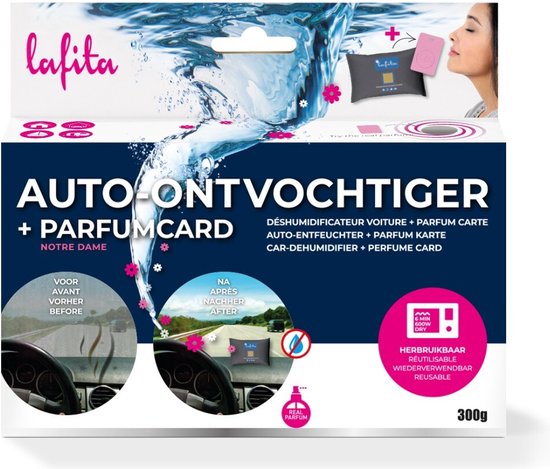 Lafita Auto Vochtvanger – 400 gram – herbruikbare vochtvreter – bevat 1 parfumkaart bloemig & houtig