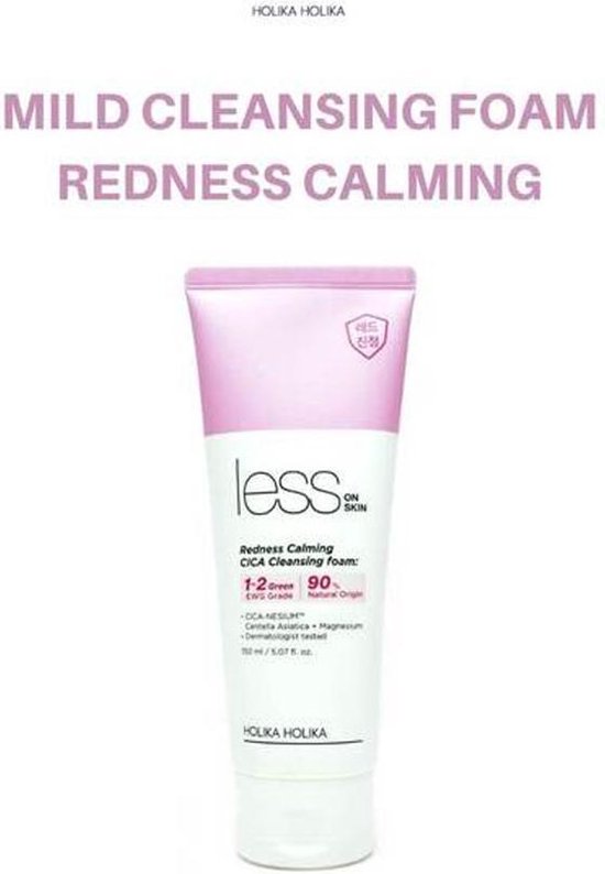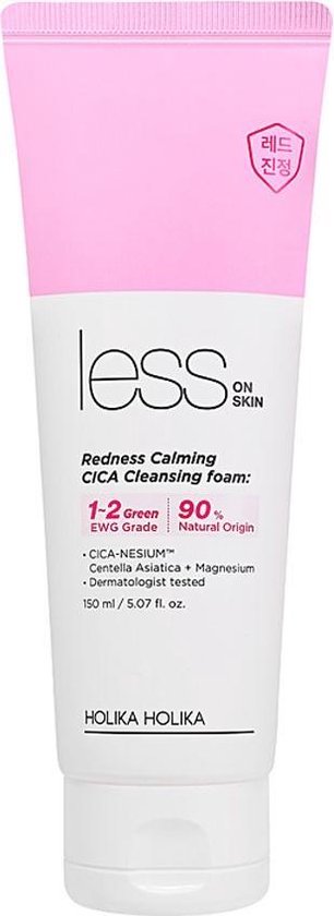 Zacht gezichtsreinigend schuim voor het reinigen van de gevoelige huid. Het Holika Holika Less on Skin Redness Calming CICA is een gezichtsreinigend schuim welke de huid zachtjes reinigt zonder deze te irriteren. De zachte natuurlijke ingrediënten verzachten en verzorgen de gevoelige huid. Het heeft een formule met een laag zuurgehalte met pH 5,5. De Cleansing Foam bevat groene en veilige ingrediënten voor de zachte verzorging van de gevoelige, geïrriteerde huid. De essentiële minerale ingrediënten, magnesium- en centella asiatica-extract, kalmeren en verlichten effectief de rode huid. Gebruik: Schuim een kleine hoeveelheid van het product op met een kleine hoeveelheid water. Breng het verschenen schuim aan op de vochtige huid van het gezicht, masseer met cirkelvormige bewegingen. Was het gezicht daarna af met lauw water. Ingrediënten: Water, Sodium Cocoyl Isethionate, Glycerin, Sodium Methyl Cocoyl Taurate, Potassium Cocoyl Glycinate, 1,2-Hexanediol, Potassium Cocoate, Centella Asiatica Extract, Magnesium Sulfate, Butylene Glycol, Mineral Salts, Biosaccharide Gum-4, Cellulose, Octyldodecanol, Echium Plantagineum Seed Oil, Helianthus Annuus (Sunflower) Seed Oil Unsaponifiables, Cardiospermum Halicacabum Flower/Leaf/Vine Extract, Tocopherol, Panthenol, Ethylene Brassylate, Salvia Sclarea (Clary) Oil, Helianthus Annuus (Sunflower) Seed Oil, Methyldihydrojasmonate, Ethyl Linalool, Linalyl Acetate, Citric Acid, Ethylhexylglycerin, Disodium EDTA, Inhoud: 150ml.