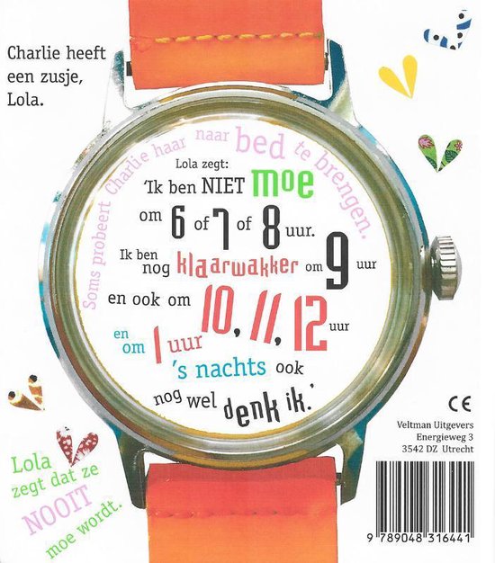 Charlie heeft een zusje, Lola. Lola zegt dat ze nooit moe wordt. Soms probeert Charlie haar naar bed te brengen. Lola zegt: ‘Ik ben niet moe om 6 of 7 of 8 uur. Ik ben nog klaarwakker om 9 uur en ook om 10, 11 en 12 uur en om 1 uur ’s nachts ook nog wel, denk ik.’