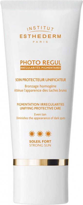Institut Esthederm Photo Regul Soin Protecteur Unificateur Soleil Fort 50 ml is een crème die pigmentvlekken helpt te verminderen door het contrast tussen de hypergepigmenteerde zones en de gebruinde huid te verkleinen en zo te zorgen voor een egale, harmonieuze bruining. Deze behandeling minimaliseert het risico op hyperpigmentatie en bevordert een gelijkmatige bruining. Het voorkomt fotoveroudering en bruine vlekken door het DNA te beschermen en celbeschadiging te voorkomen dankzij de gepatenteerde Global Cellular Protection-technologie. Het voorkomt het verschijnen van rimpels door factoren die collageen afbreken tegen te gaan. Resultaat: Een lichte, egale bruining en minder pigmentonregelmatigheden. Ideaal voor blootstelling aan sterk zonlicht: hoge bergen, tropen, boten, langdurige blootstelling.