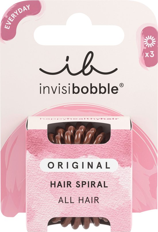 Invisibobble ORIGINAL Pretzel Brown is hét nieuwe elastiek van nu in een heldere kleur. Wanneer er een normaal elastiek gebruikt wordt, ontstaan er striemen of bobbels in het haar. De uiteinden van invisibobble zijn niet zoals andere elastieken aan elkaar verbonden met een stuk ijzer, maar aan elkaar gelast. Hierdoor wordt het haar niet beschadigd of uit het hoofd getrokken. Doordat de invisibobble het haar niet samenknijpt maar de druk gelijk verdeeld, zal het haar ook niet te strak zitten, waardoor hoofdpijn voorkomen wordt. invisibobble is waterbestendig en rekt niet uit. Het is niet alleen mooi in het haar, maar kan ook gebruikt worden als een leuk accessoire zoals een armband! invisibobble is verkrijgbaar in verschillende kleuren.