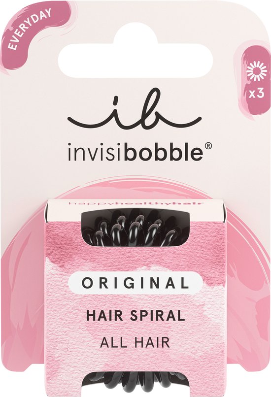 Invisibobble ORIGINAL True Black is hét nieuwe elastiek van nu in een heldere kleur. Wanneer er een normaal elastiek gebruikt wordt, ontstaan er striemen of bobbels in het haar. De uiteinden van invisibobble zijn niet zoals andere elastieken aan elkaar verbonden met een stuk ijzer, maar aan elkaar gelast. Hierdoor wordt het haar niet beschadigd of uit het hoofd getrokken. Doordat de invisibobble het haar niet samenknijpt maar de druk gelijk verdeeld, zal het haar ook niet te strak zitten, waardoor hoofdpijn voorkomen wordt. invisibobble is waterbestendig en rekt niet uit. Het is niet alleen mooi in het haar, maar kan ook gebruikt worden als een leuk accessoire zoals een armband! invisibobble is verkrijgbaar in verschillende kleuren.