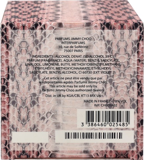 Parfums Femme Jimmy Choo Imaginez une fragrance alliant feminite luxe et elegance le nouveau parfum Jimmy Choo Il est synonyme de style strass et tapis rouge avec une touche de provocation La premiere fragrance qui enveloppe la femme qui le porte de sensualite et de seduction grace a un delicieux accord chypre fruite aux nuances chaudes riches et boisees Inspire par les femmes modernes il est fort puissant tout en seduction alliant mystere et sensualite Un objet de desir irresistible Jimmy Choo offre ainsi glamour et sophistication dans un precieux flacon a facettes inspire par le verre de Murano