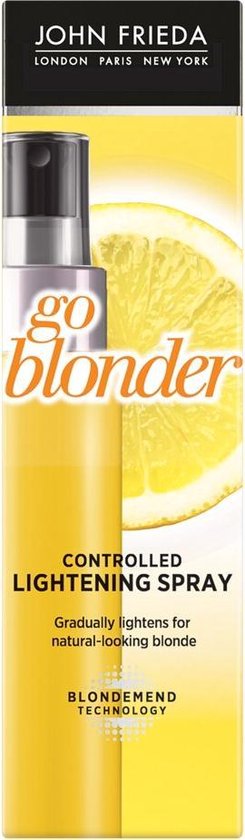 John Frieda Sheer Blonde Spray Go Blonder om blond haar op te lichten en te verhelderen. Bevat peroxide. Licht geleidelijk op in 3-5 keer. Maximale oplichting na niet meer dan 10 toepassingen. Met hittebescherming. Gebruik niet op van nature bruin haar of donderdere haartinten, sterk geblondeerd haar (4-8 tinten) of plantina- of witblond haar.