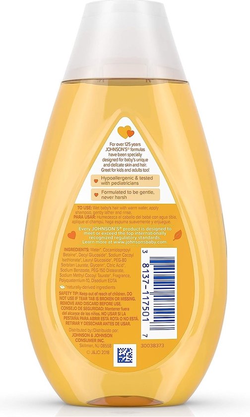 Johnson’s Baby Shampoo zorgt voor een milde, zachte reiniging die de ogen van uw baby niet irriteert tijdens het baden. Deze zachte babyshampoo is speciaal ontwikkeld voor fijn babyhaar en een gevoelige hoofdhuid en maakt het haar van uw kleintje zacht en glanzend en laat het fris ruiken. Johnson’s No More Tears formule is net zo zacht voor de ogen als zuiver water. Deze traanvrije shampoo is hypoallergeen, getest door een kinderarts en vrij van parabenen, ftalaten, sulfaten en kleurstoffen. Maak het haar van uw baby nat met warm water, breng de shampoo aan, laat hem zachtjes schuimen en spoel hem uit. Al meer dan 125 jaar worden Johnson’s formules speciaal ontworpen voor de unieke en delicate huid en het haar van baby’s, en deze babyshampoo is ontworpen om te voldoen aan de hoogste internationaal erkende regulerende normen of deze te overtreffen.