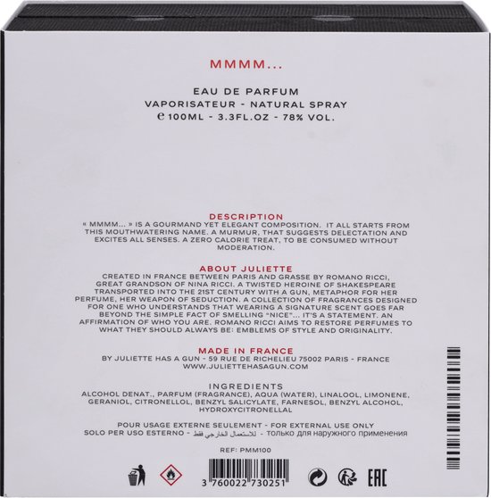 Juliette Has a Gun Mmmm is a blend of sweet and floral accords that is luscious deep and balanced The fragrance introduced in 2016 opens with juicy tart raspberry one of the most notable notes in the concoction along with rose like geranium and orange scented neroli The heart of the perfume contains the subtle floral scents of tuberose orange blossom jasmine and iris