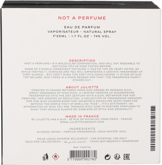 Juliette Has a Gun Not a Perfume Eau de Parfum Spray Not A Perfume van Juliette Has a Gun is eigenlijk geen parfum zoals de naam al zegt wat resulteert in een minimalistische elegante en pure geur De geur ontwikkeld zich bij iedereen weer anders door de huideigen sensualiteit Het is een geur die bestaat uit A c A c n molecuul ambroxan De geur is dus opgebouwd zonder natuurlijke stoffen en is geschikt voor de meeste gevoelige huid omdat het allergeen vrij is