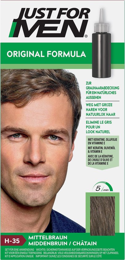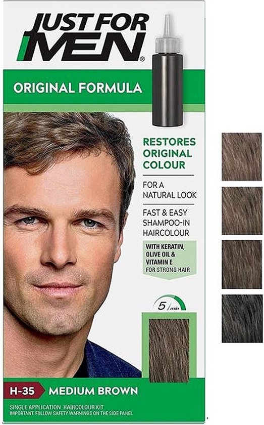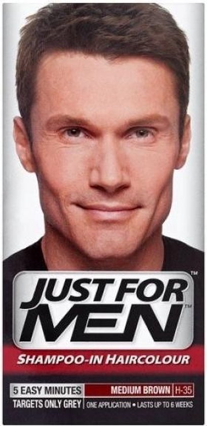 Just For Men Hair Color – Medium Brown H35, Just For Men is speciaal voor (beginnende) grijze haren. Het zorgt ervoor dat het grijs wordt vervangen door een subtiele kleur die overeenkomt met uw eigen natuurlijke haarkleur. De formule werkt in 5 minuten en druppelt niet. Just For Men is gemengd met vitamines en dit zorgt ervoor dat het haar dikker en voller wordt. De ammonia-vrije formule zorgt ervoor dat uw haar niet beschadigt. De kleur blijft u tot 6 weken behouden, tot er weer grijze uitgroei verschijnt. Inhoud: Just For Men Hair Color – Medium Brown H35