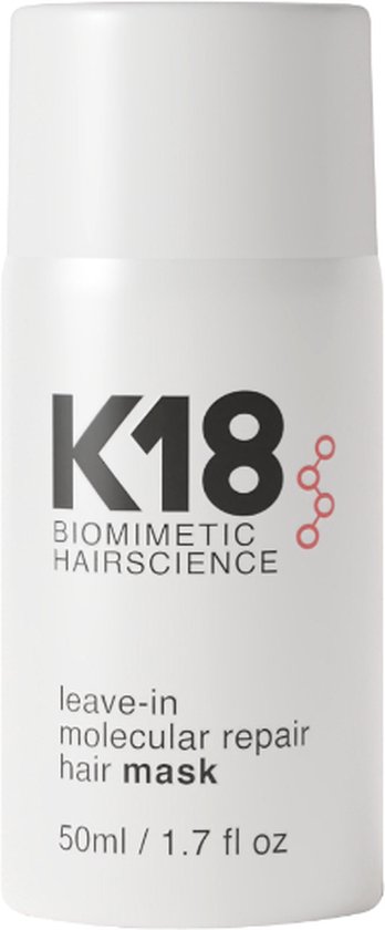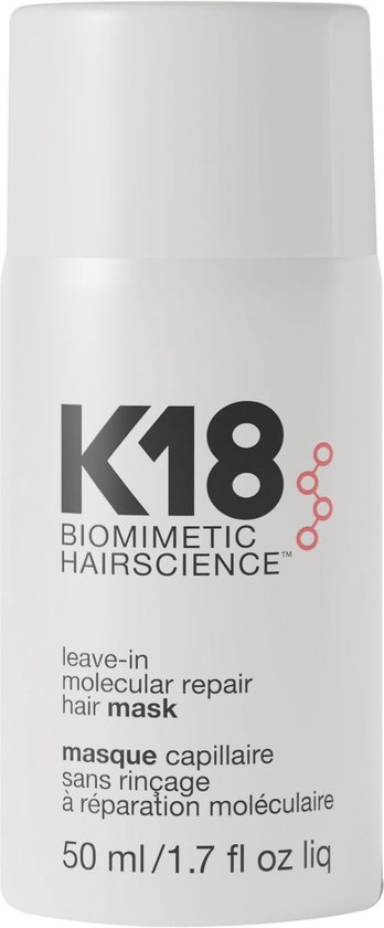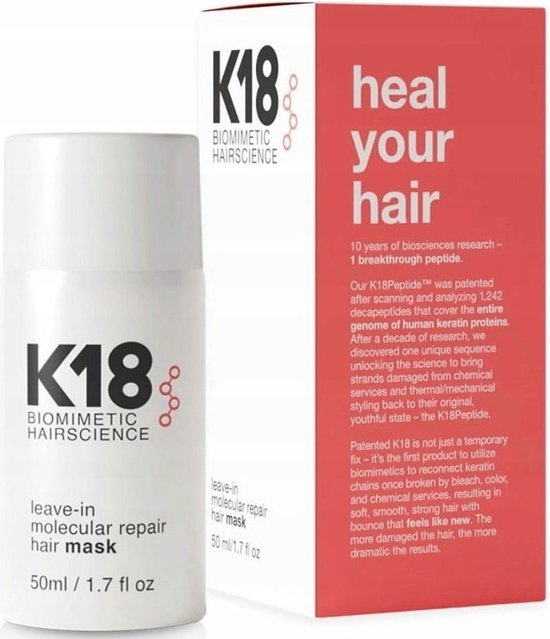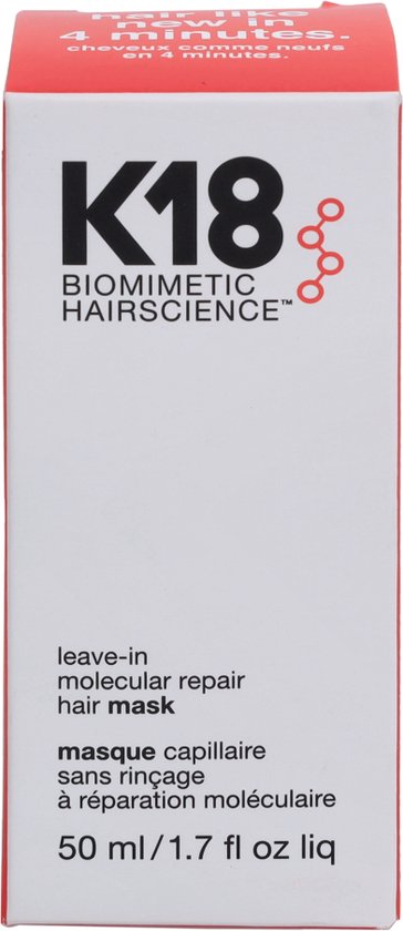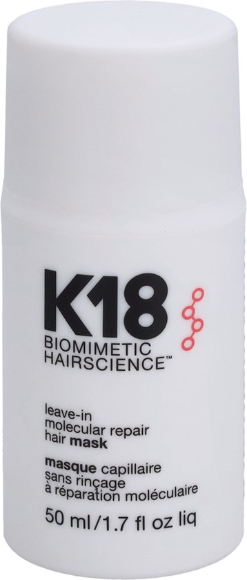 K18 Hair Leave-in Molecular Repair Mask is gepatenteerde bio-actieve peptide dat de elasticiteit versterkt en verbetert van je haren. De behandeling is geschikt voor haar dat beschadigd is geraakt door chemische behandelingen of het gebruik van hittetools. Het herstelt op een peramente manier, de schade van chemische behandelingen en hittestyling. Bevat een unieke reeks peptiden die het mogelijk maakt het haar tot diep in de wortels te herstellen. In slechts 4 minuten wordt de natuurlijke keratine structuur van het haar gerepareerd en is het haar weer als nieuw. Het product is lichtgewicht en heeft hydraterende eigenschappen. K18 is het eerste product dat biomimetica gebruikt om keratine ketens opnieuw te verbinden en aan te vullen die verbroken waren door bijvoorbeeld blonderen, kleuren of gebruik van stylingtools. Het resultaat is zacht, glad en sterk haar met veerkracht dat weer als nieuw aanvoelt.