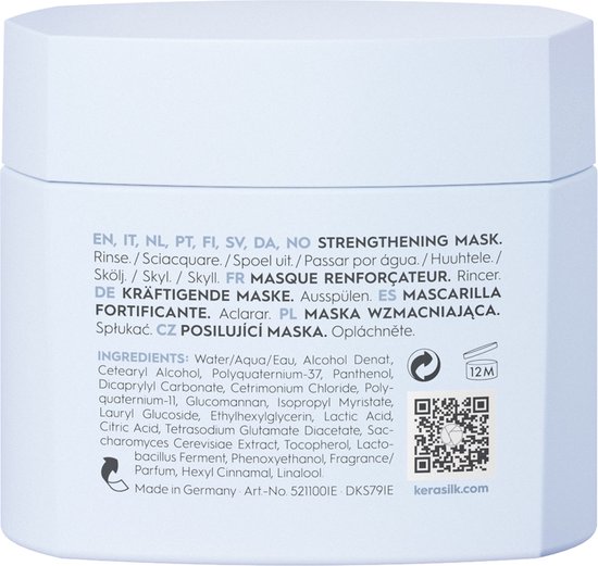 Kerasilk – Strengthening Mask is een intensief, diep verzorgend masker verrijkt met Biomimetic Silk & Konjac Root Powder. Onze 100% vegan formule (geen dierlijke ingrediënten) versterkt en hydrateert het haar en maakt het voller van binnenuit – voor haar dat tot 18x krachtiger is. Belangrijkste eigenschappen * Haar is tot 18x krachtiger*. * Tot 99% minder haarbreuk*. * Langdurige hydratatie tot 5x wassen*. * – instrumentele test – vergelijking met geen product. Gebruiksaanwijzing * Masseer in het haar. * Laat 5 minuten inwerken of naar wens langer en spoel uit. Kerasilk – Strengthening Mask online kopen bij Shop dus nu de Kerasilk – Strengthening Mask, dan zorgen wij dat deze snel bij je thuis wordt bezorgd!