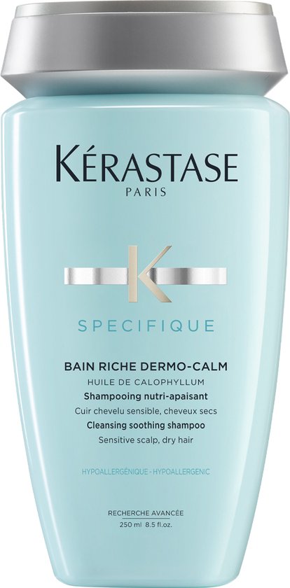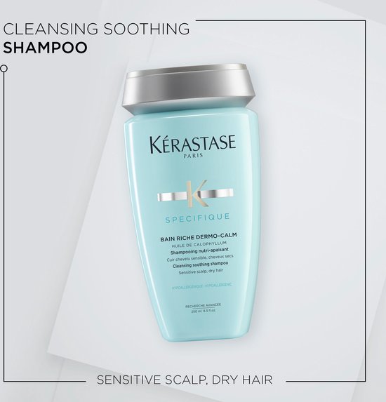 Kérastase Spécifique Bain Riche Dermo Calm Shampoo voor een gevoelige hoofdhuid en droog haar richt zich op de oorzaken van irritatie van de hoofdhuid. De hoofdhuid wordt gezuiverd door actieve anti-bacteriële middelen en droog haar is weer gevoed. De shampoo vermindert gevoeligheid en jeuk aan de hoofdhuid. Het haar behoudt haar lichtheid en vitaliteit. De Calophyllum Olie in de formule zorgt ervoor dat irritaties en ontstekingen worden gekalmeerd. Piroctone Olamine voorkomt jeuk. Glycerol hydrateert en verzacht de hoofdhuid en beschermt tegen externe factoren. Mentho Derivative frist de hoofdhuid op. De formule is hypoallergeen, siliconenvrij en dermatologisch getest.