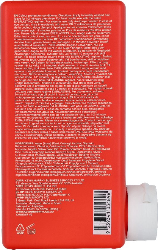 De Kevin Murphy EVERLASTING COLOUR EVERLASTING.RINSE is een conditioner speciaal ontwikkeld voor gekleurd haar. Deze conditioner helpt om de kleur langer te behouden en voorkomt vervaging. Het zorgt voor een diepe hydratatie en voedt het haar intensief, waardoor het zijdezacht en glanzend wordt. Daarnaast beschermt het tegen schadelijke invloeden van buitenaf, zoals UV-straling en hitte van stylingtools. De EVERLASTING.RINSE conditioner is geschikt voor dagelijks gebruik en is verrijkt met natuurlijke ingrediënten die het haar verzorgen en versterken.