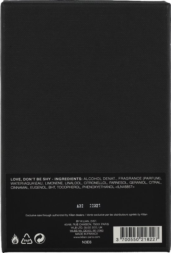 Released in 2007 by Kilian, Kilian Love Don’t Be Shy captures the blush of first love in a feminine fragrance. This oriental blend begins with citrusy top notes of neroli, bergamot, and coriander. Pink pepper adds a touch of spice and is then mellowed by the floral scents of rose, iris and jasmine.