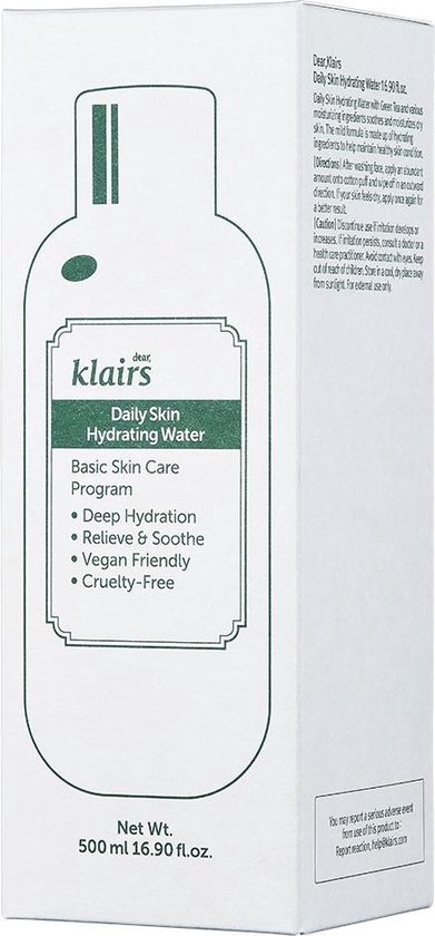 Deze verfrissende toner is perfect voor jou als je last hebt van een geïrriteerde huid! De Klairs Daily Skin Hydrating Water bestaat voor 45% uit groene theewater, dit heeft antioxiderende effecten om de huid te kalmeren. De toner bevat ook extractwater van kokospalm en Calendula, deze ingrediënten zorgen er voor dat de huid diep wordt gehydrateerd zonder dat de huid plakkerig aanvoelt. Doordat de waterige textuur snel door de huid wordt opgenomen, kan deze lichte toner in elk seizoen op elk huidtype dagelijks worden gebruikt. Voor mensen die de voorkeur geven aan een lichte en verfrissende toner is dit product perfect! Gebruiksaanwijzing: Stap 1: breng ’s ochtends en ’s avonds na het reinigen van de huid een ruime hoeveelheid aan met een wattenschijfje, Stap 2: breng hierna een gezichtscrème aan. Inhoud: 500ml.