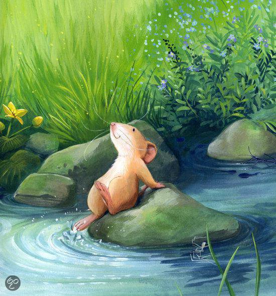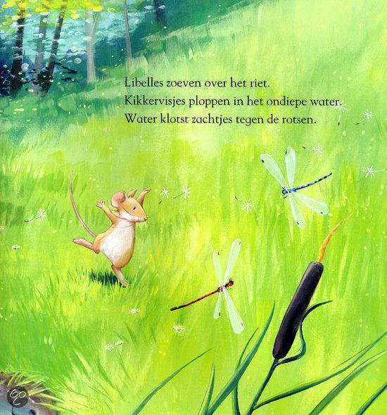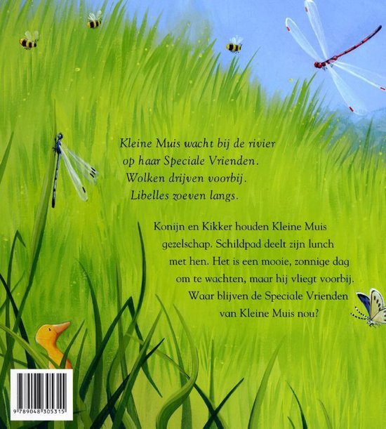 Kleine Muis wacht bij de rivier op haar Speciale Vrienden. Wolken drijven voorbij. Libelles zoeven langs.