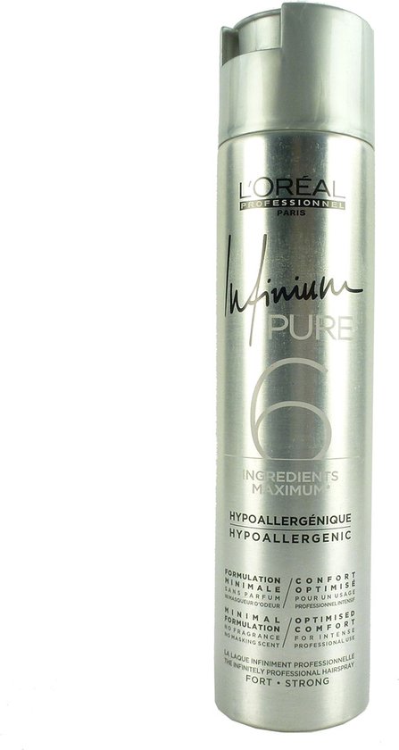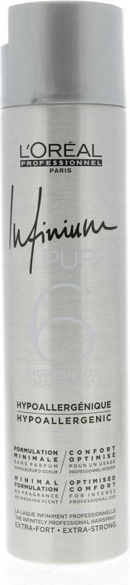 LOrA c al Infinium Pure The Infinitely Professional Hairspray Extra Fort Extra Strong De eindeloos professionele haarspray een backstage icoon Extra sterke nieuwe formule zonder parfum of maskerende geur neutrale geur tijdens het opbrengen en laat geen geur achter De meest fijnste professionele verstuiving optimaal comfort aangepast voor intensief prrofessioneel gebruik onmiddelijke hold zonder stijf effect ultra droog geen zichtbare residus optimale glans