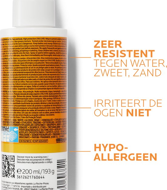 La Roche-Posay Anthelios Onzichtbare Spray SPF30 met parfum biedt een hoge breedspectrum bescherming tegen UV-A- en UV-B-stralen, dankzij de XL-Protect filtertechnologie. Zijn frisse en lichte textuur laat geen witte sporen na en is geschikt voor alle huidtypes. De formule met Netlock-technologie creëert een sterk netwerk van beschermingsmechanismen voor een homogene bescherming tegen de schadelijke gevolgen van UV-A-, UV-B-, infrarood A-stralen en vervuiling. Zeer bestendig tegen water, zweet en zand.Irriteert de ogen niet. Lichte finish en plakt niet.De formule creëert een sterk netwerk van beschermingsmechanismen om op een homogene, absorberende, niet-vette en resistente manier te beschermen.Dermatologisch getest.Hypoallergeen.Ultra-vloeibaar.Laat geen witte schijn na.Niet vet.Plakt niet. RESULTATENAnthelios is een pionier in de markt van zonneproducten. De hoge breedspectrum bescherming is het resultaat van meer dan 25 jaar geavanceerd klinisch onderzoek naar zonneproducten en gevoelige huid.