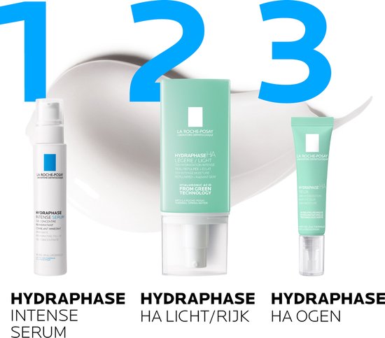 Na uw huid te hebben gereinigd, breng eerst het Hydraphase Intense Serum aan en vervolgens een gezichtscrème uit het Hydraphase Gamma. Zo kunt u kiezen uit de Hydraphase HA Licht of Rijk. Als u een dagcrème wil met UV-bescherming, kies dan voor de Hydraphase UV Intense Licht of Rijk met SPF20. Sluit uw routine af met de Hydraphase Intense Oogcrème.
