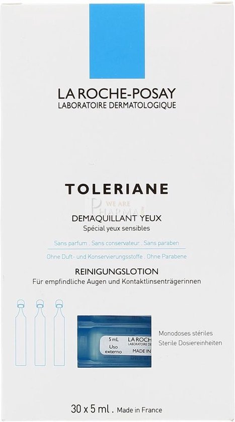 De Toleriane Ultra Make-upremover van La Roche-Posay reinigt en verwijdert make-up onmiddellijk en doeltreffend zonder te wrijven. Deze reiniging kalmeert en herstelt onmiddellijk het huidcomfort en is geschikt voor een ultragevoelige of huid met neiging tot allergie, gevoelige ogen of dragers van contactlenzen. De Toleriane Ultra Demaquillant garandeert een reinigende werking door de aanwezigheid van natriumhyaluronaat, traditioneel gebruikt in de oogheelkundige chirurgie. De reiniger is strikt geformuleerd om de risico’s van intolerantie tot een minimum te beperken. Zonder parfum en zonder alcohol. Verpakt in 30 steriele 5 ml flesjes, makkelijk mee te nemen. APPLICATIE:Doordrenk een wattenschijfje met de Toleriane Ultra Demaquillant en breng het als een kompres aan op het gesloten oog. Verwijder voorzichtig het make-up zonder te wrijven. Gebruik vervolgens een ander wattenschijfje voor het tweede oog en een derde om het gelaat te reinigen. Deze reiniger is niet geschikt voor waterproof make-up.