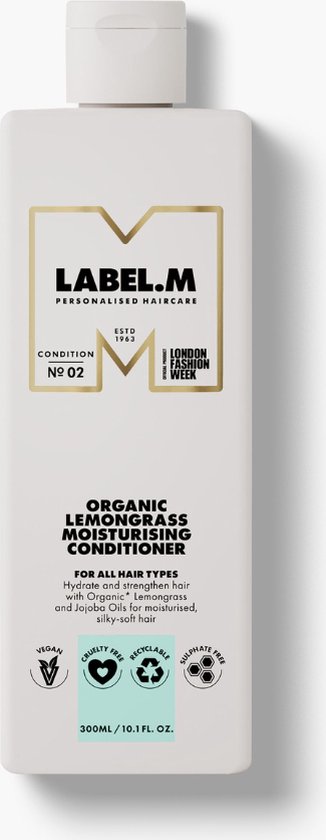 Label.M Organic Moisturising Lemongrass Conditioner is een heerlijk, zachte crème voor het haar. Deze conditioner hydrateert en verzacht de haren optimaal. De conditioner bevat namelijk een hoge concentratie biologische ingrediënten waaronder haver, rijstmelkpoeder en kweepeer. Dat betekent dat het haar kan genieten van een natuurlijke verzorging. Door de heerlijke citroengrasextracten kan het haar genieten van een fris aroma dat tevens een verfrissend effect heeft op de hoofdhuid. De conditioner is geschikt voor ieder haartype en vrij van sulfaten. Alle producten van Label.M zijn volledig vegan.