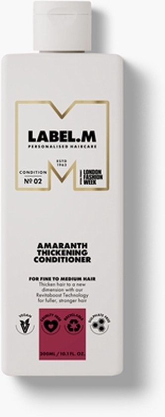 Label.m Thickening Conditioner is een zachte crème die de haren meer volume geeft. Daarnaast zorgt de conditioner er ook voor dat het haar wordt gevoed en gehydrateerd. De conditioner is geschikt voor ieder haartype en bevat het exclusieve NRG Complex en Time-Release Technology. Dit zorgt ervoor dat het haar kan genieten van meer body en meer textuur. Daarnaast verzwaart de conditioner het haar niet, worden de haren gladder, vrij van klitten en wordt het haar gehydrateerd.