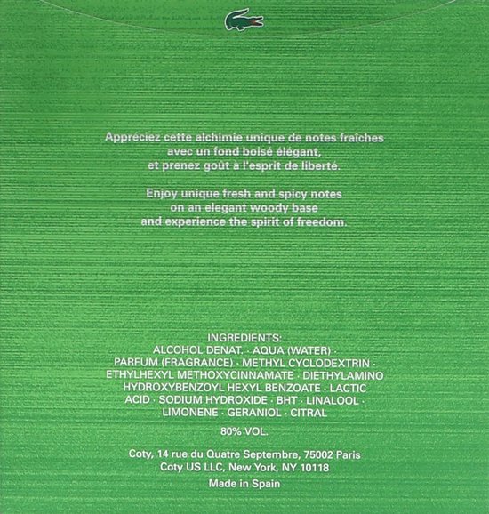 Essential van Lacoste is een levendige, frisse en houtachtige geur, bekrachtigd met de groene noten van zwarte bessenblad en tomatenbladeren. Na een opwekkend, zwarte-peper hart, evolueert de geur naar een finish gedomineerd door sandelhout. Het verkwikkende parfum werd in 2005 gelanceerd.
